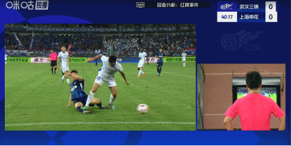 半场的尾声阶段,申花队员特谢一次拉踩踏邓涵文行为使得VAR介入,但主裁判邢琦最终出示黄牌。